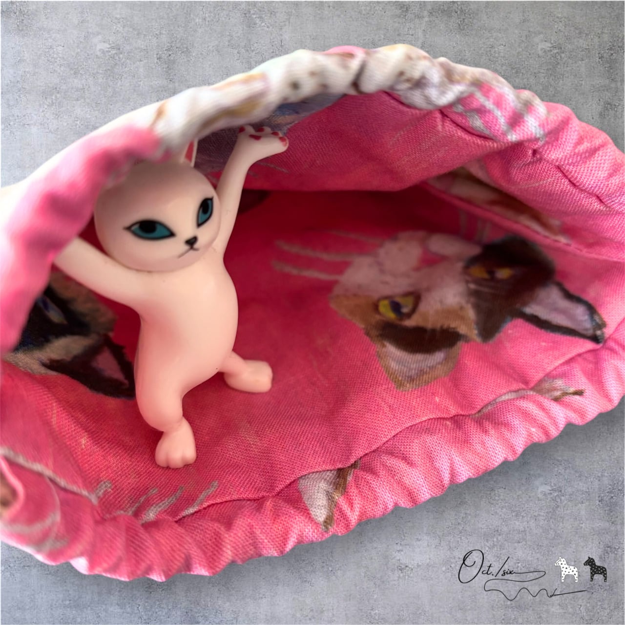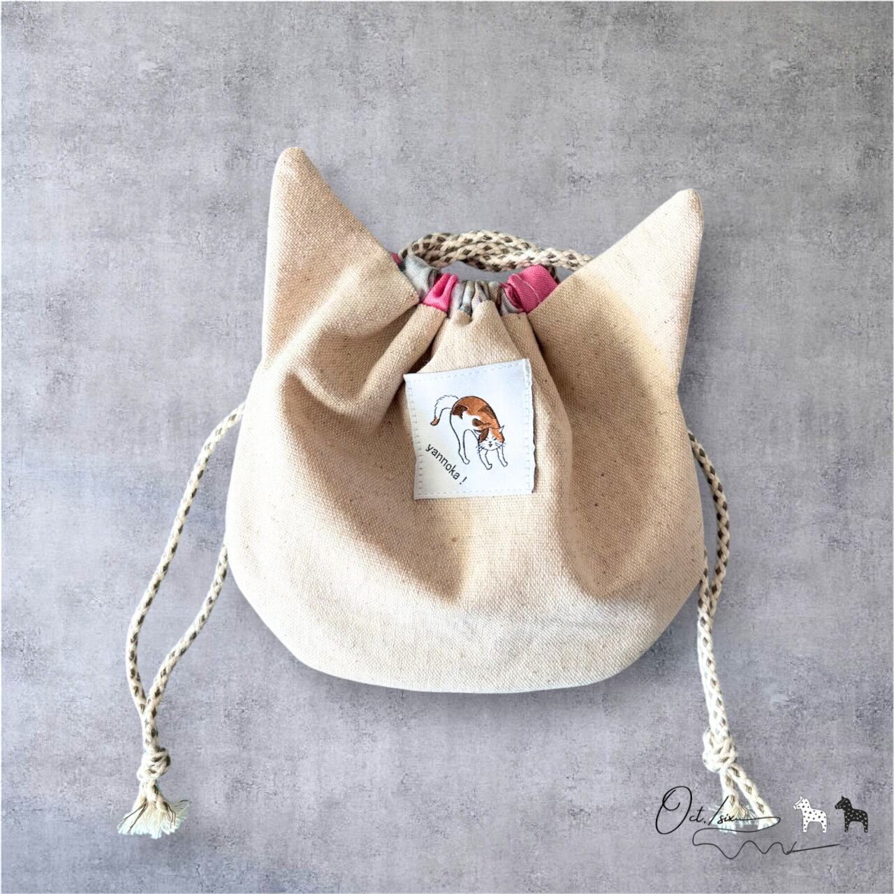 外側はシンプルなリネン生地、内側はニャンコフェイスの生地となっています。